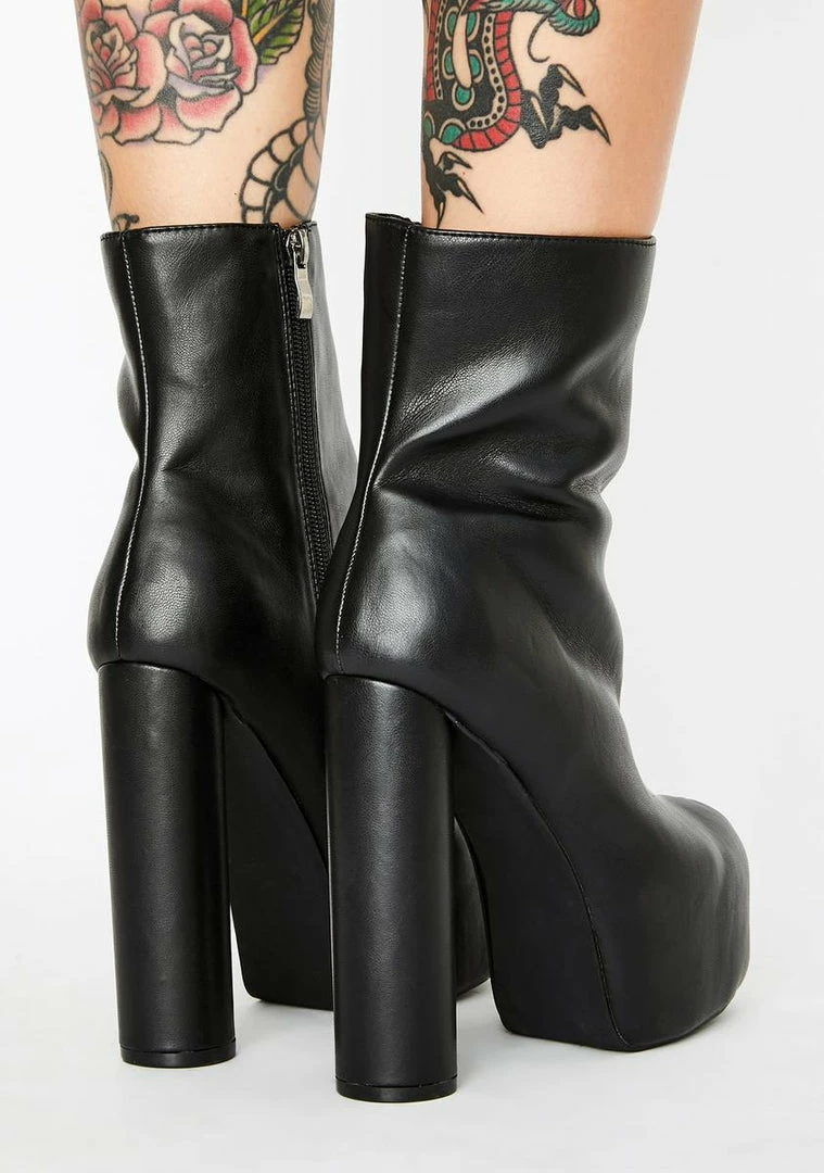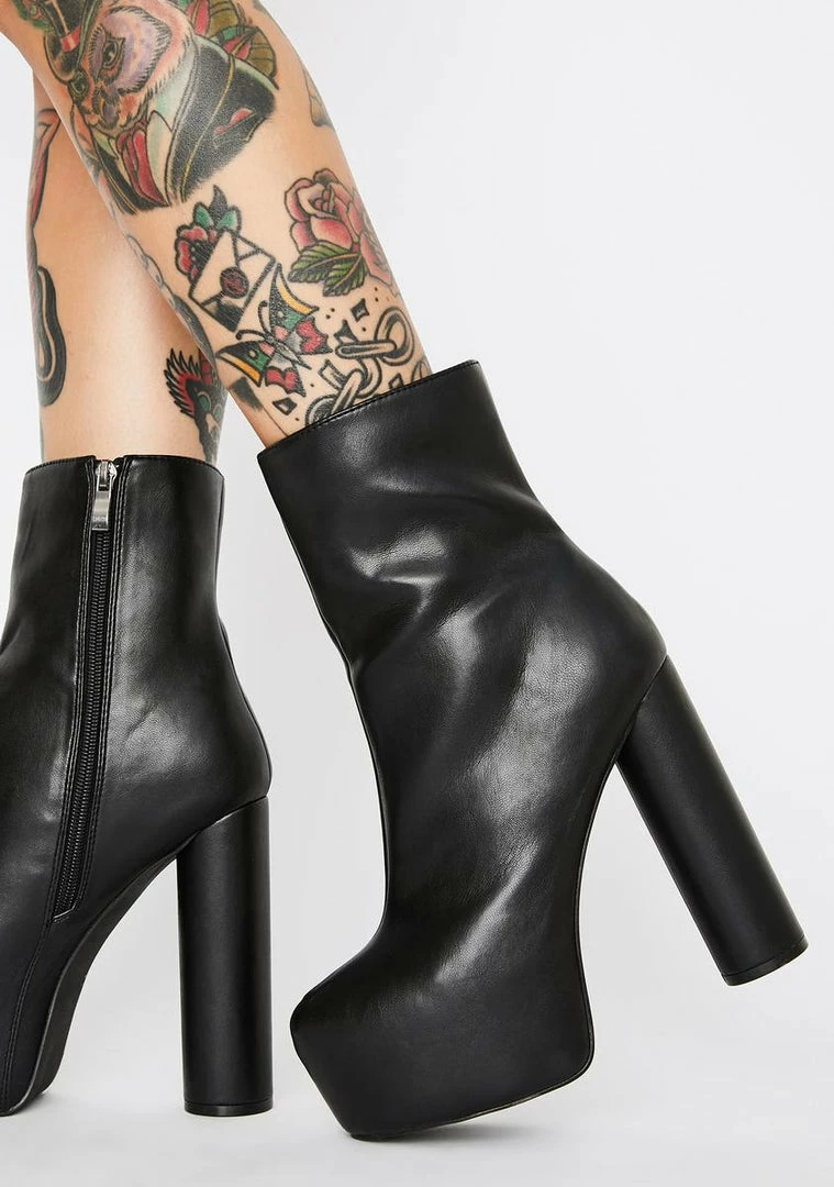 cuz youâre feelinâ hella sassy tonight! Strut ya stuff in these platform boots that have a sleek vegan leather construction, chunky rounded heels Nâ side zip closures.