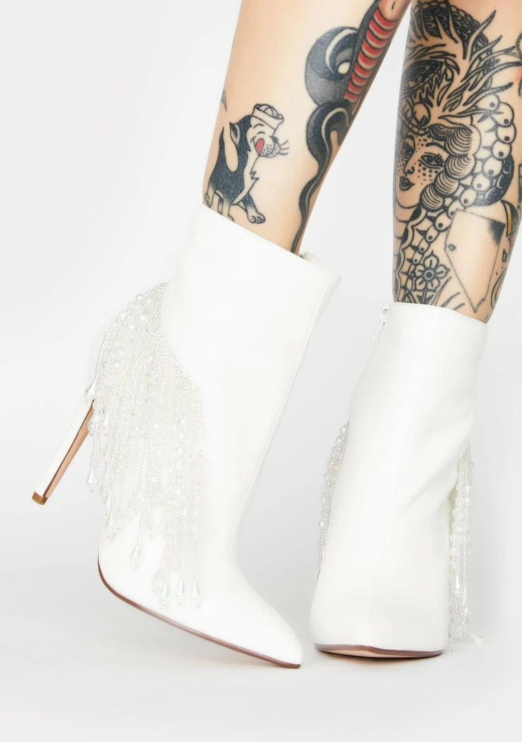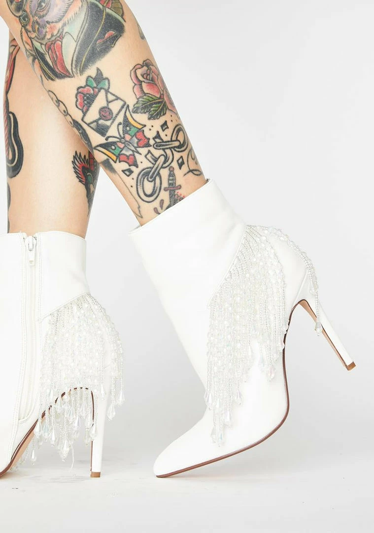 will have a drippinâ class! Youâre on a whole new level in these luxurious vegan leather booties that have gorgeous beaded chandelier fringe, pointed toes, flirty stiletto heels, and side zip closures.