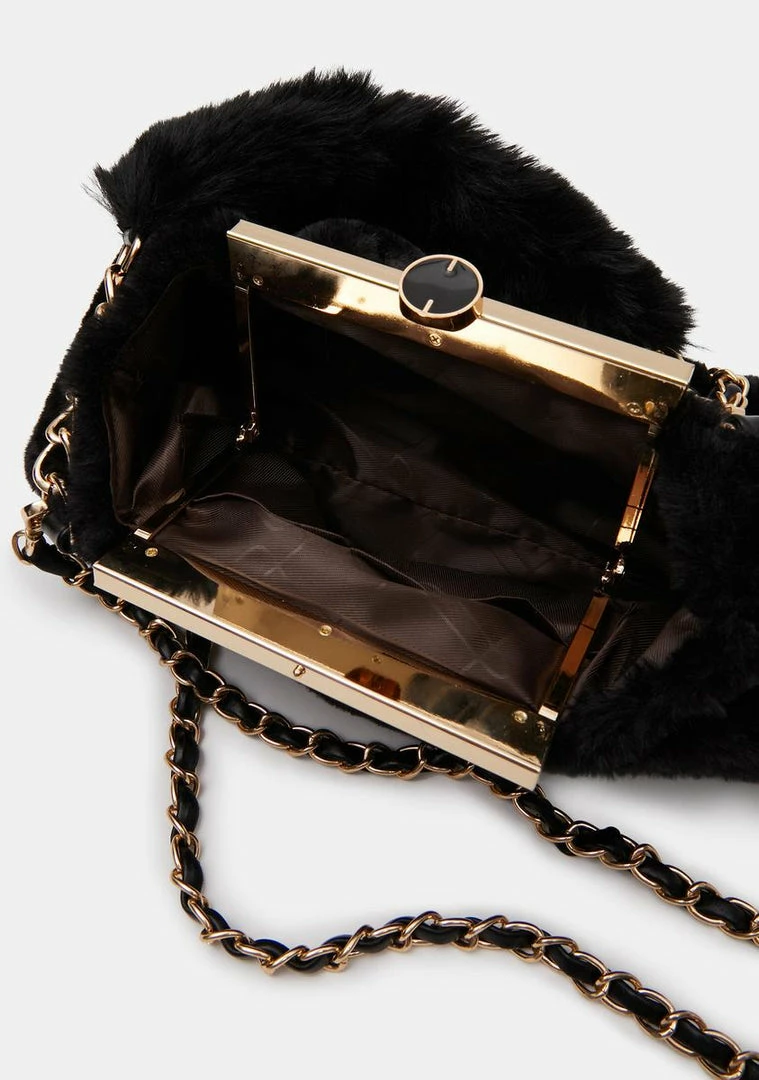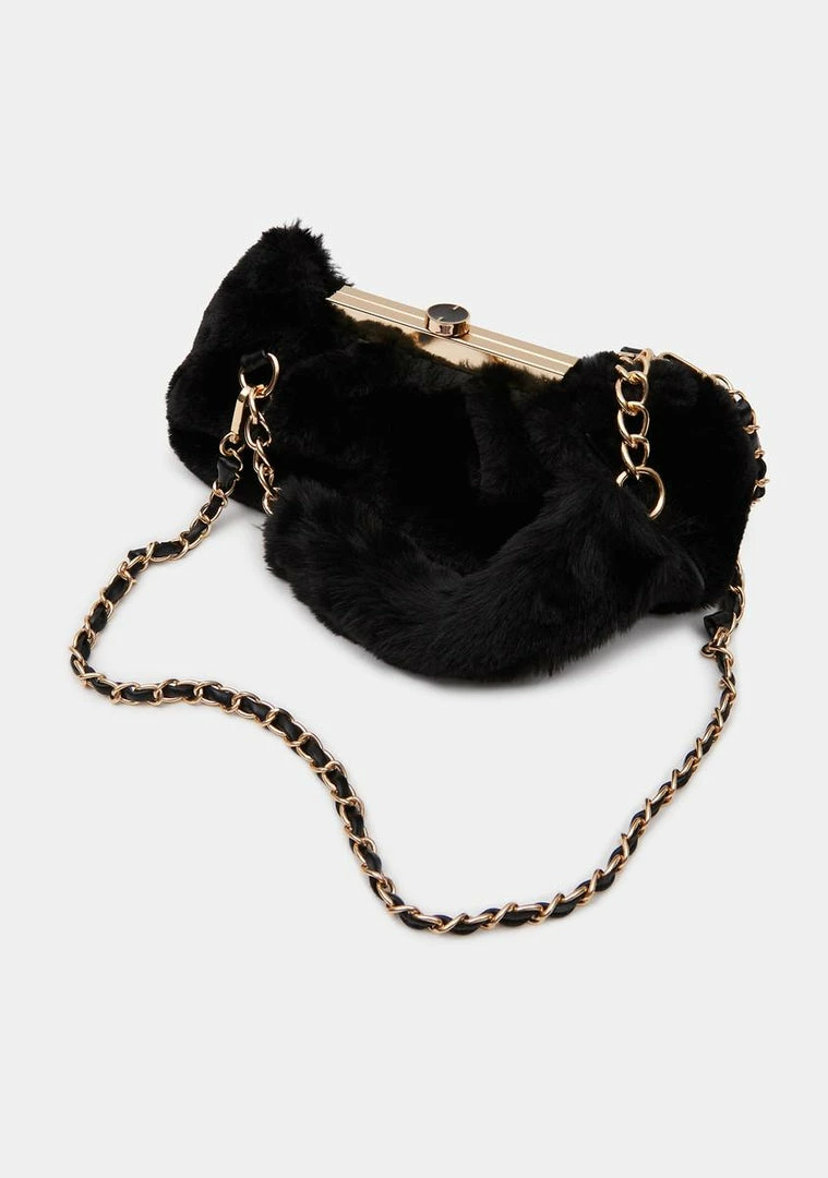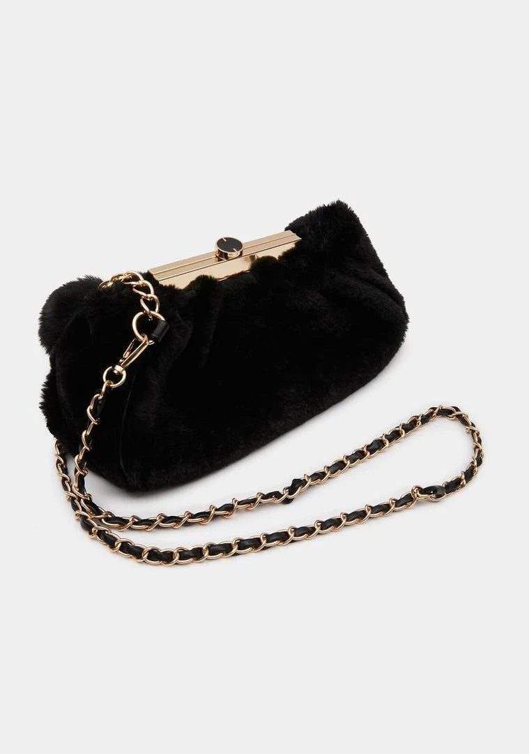 has a soft faux fur construction and comes with a braided chain shoulder strap.