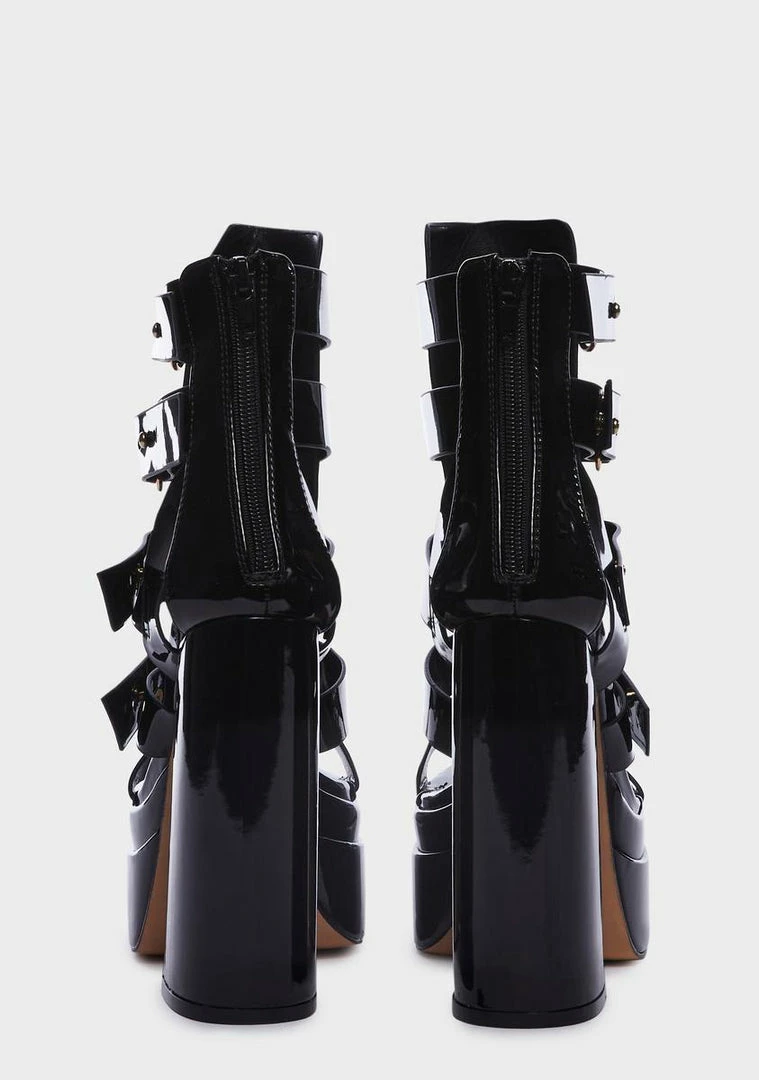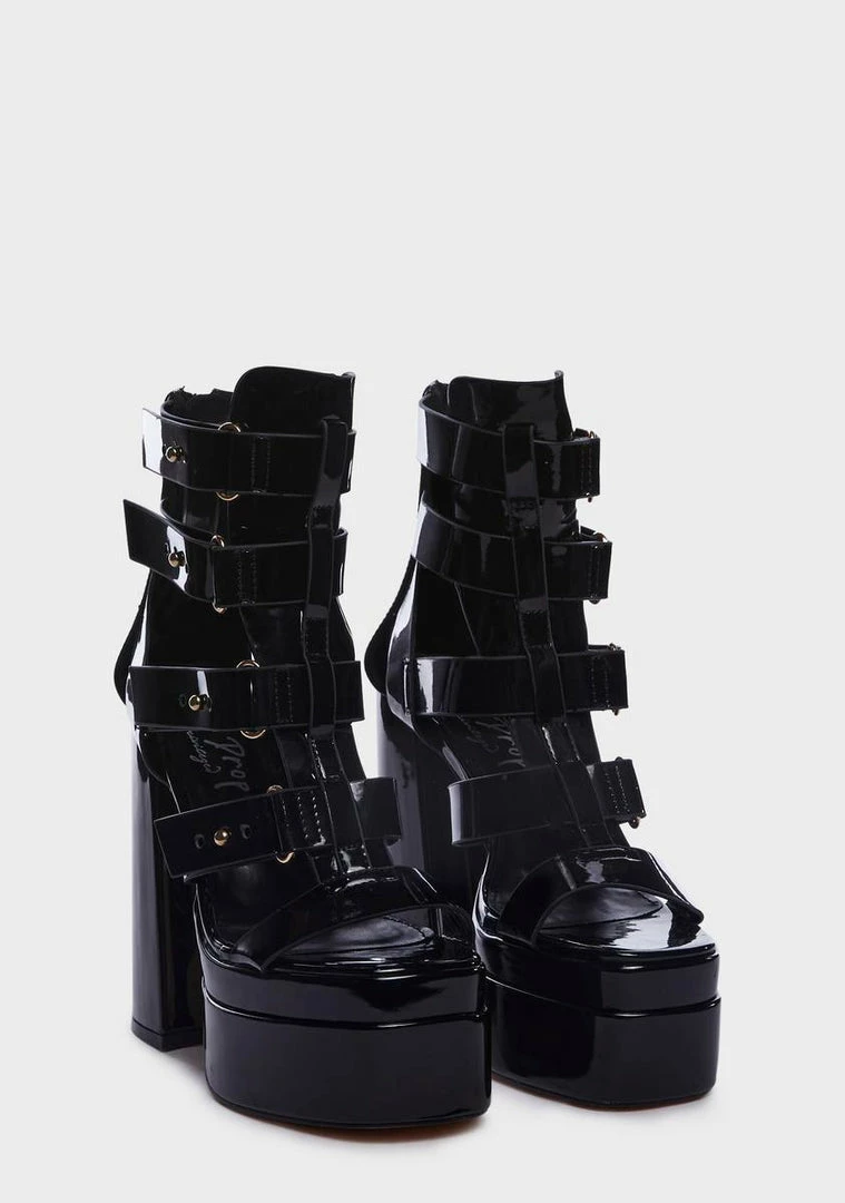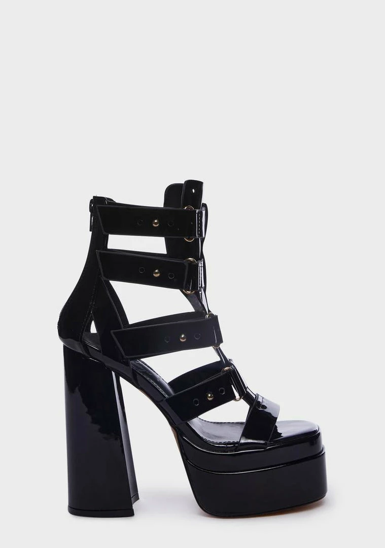 cuz you’re a total flirt! These platform block heels have a patent vegan leather construction, adjustable straps, and back zip closures.