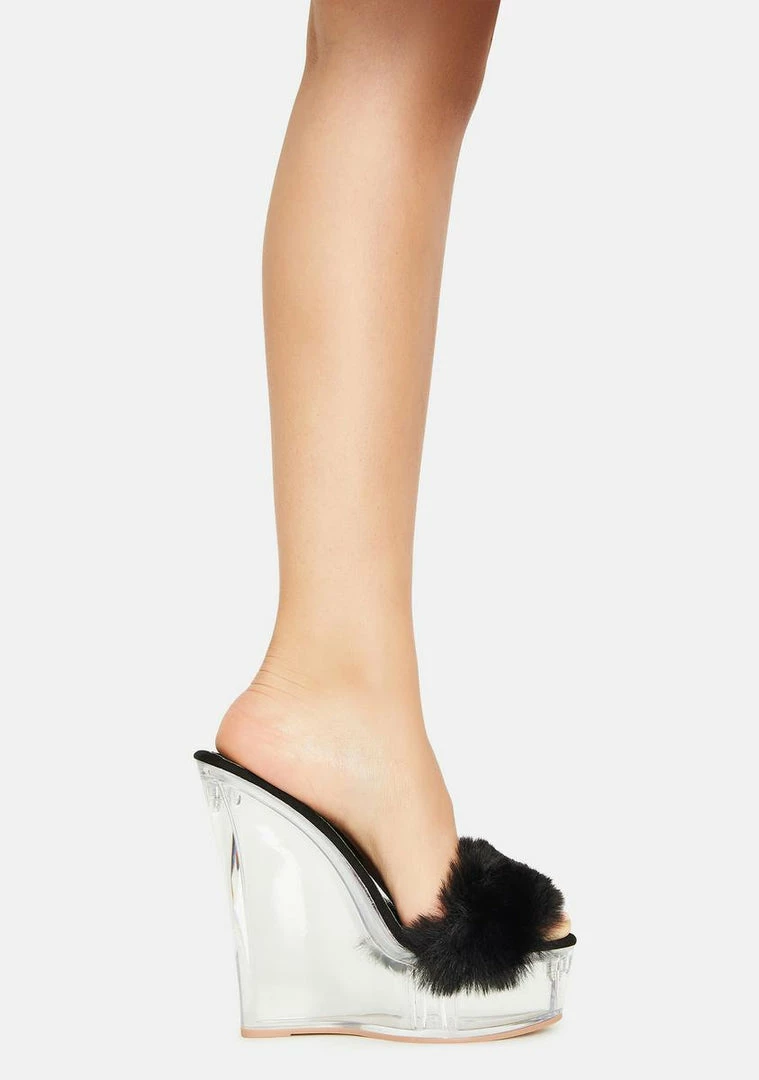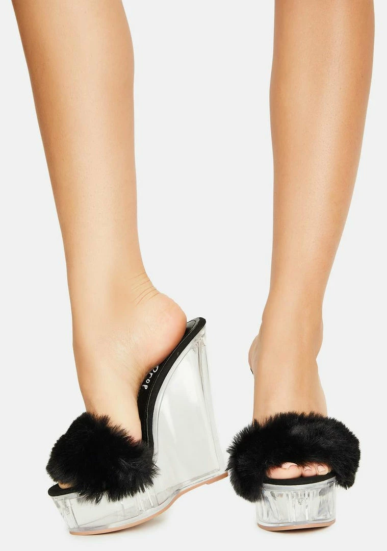 feature faux fur toe straps, a slip on fit, and clear wedge heels.