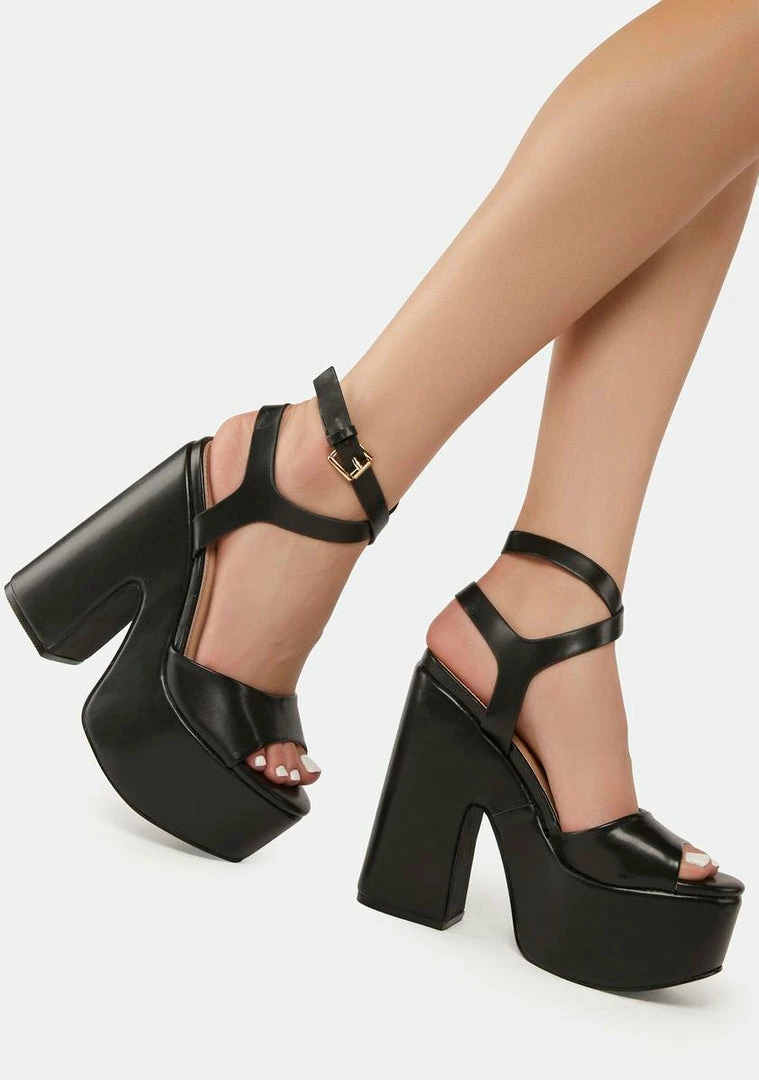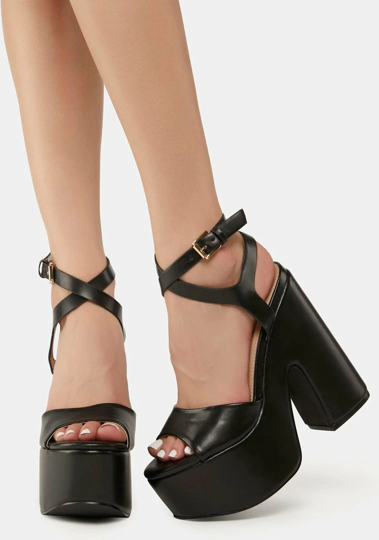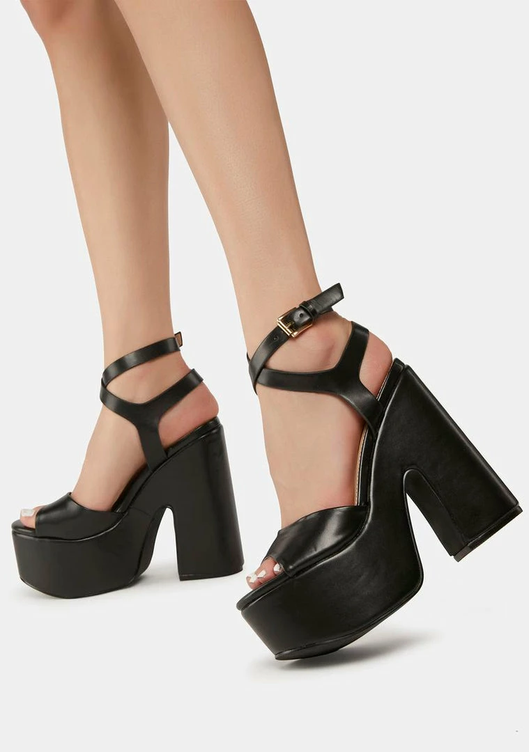 you’re it. These shoes come in a vegan leather construction, with a platform heel, open toe, and a crossed ankle strap with a buckle closure.