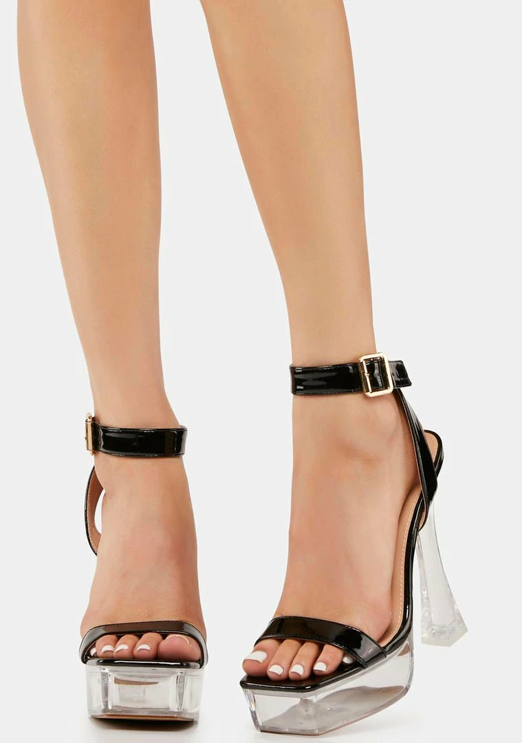 cuz you call the shots babe! Look amazing in these clear heels that have vegan leather uppers, clear platform soles, clear stiletto heels, a square toe design, and ankle buckle closures.