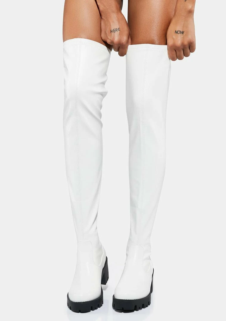 have a treaded sole and chunky heel, a vegan leather construction, and a thigh high rise.
