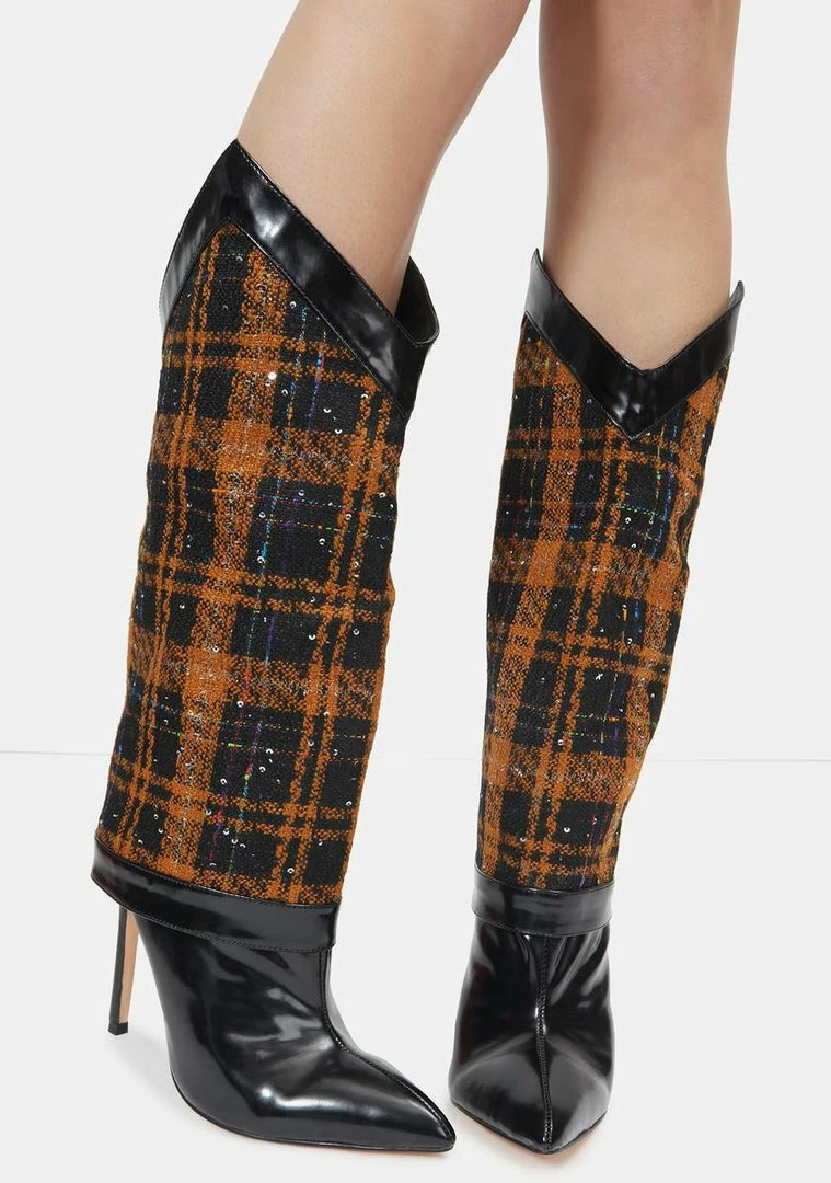 have vegan leather uppers with plaid textile shafts, a slip on fit, pointed toes, and stiletto heels.