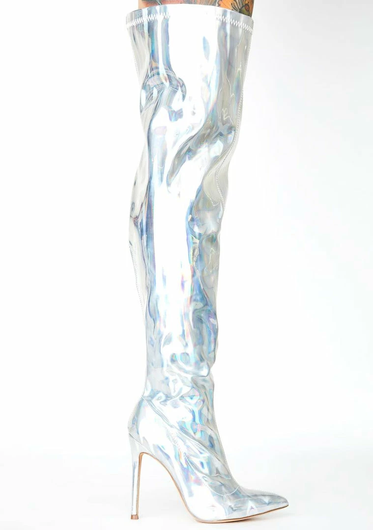 got you living your xxtra life, bb. Steal the spotlight in these thigh high boots that have a holographic construction, a pointed toe, a stiletto heel NΓ’ΒΒ side zip closures.