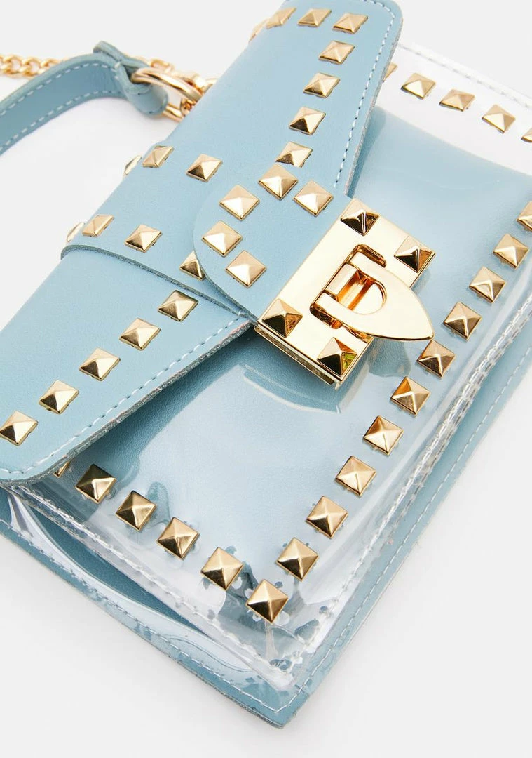 has gold studded trim all over, a clear half construction, a long chain shoulder strap, and a clasp lock closure.