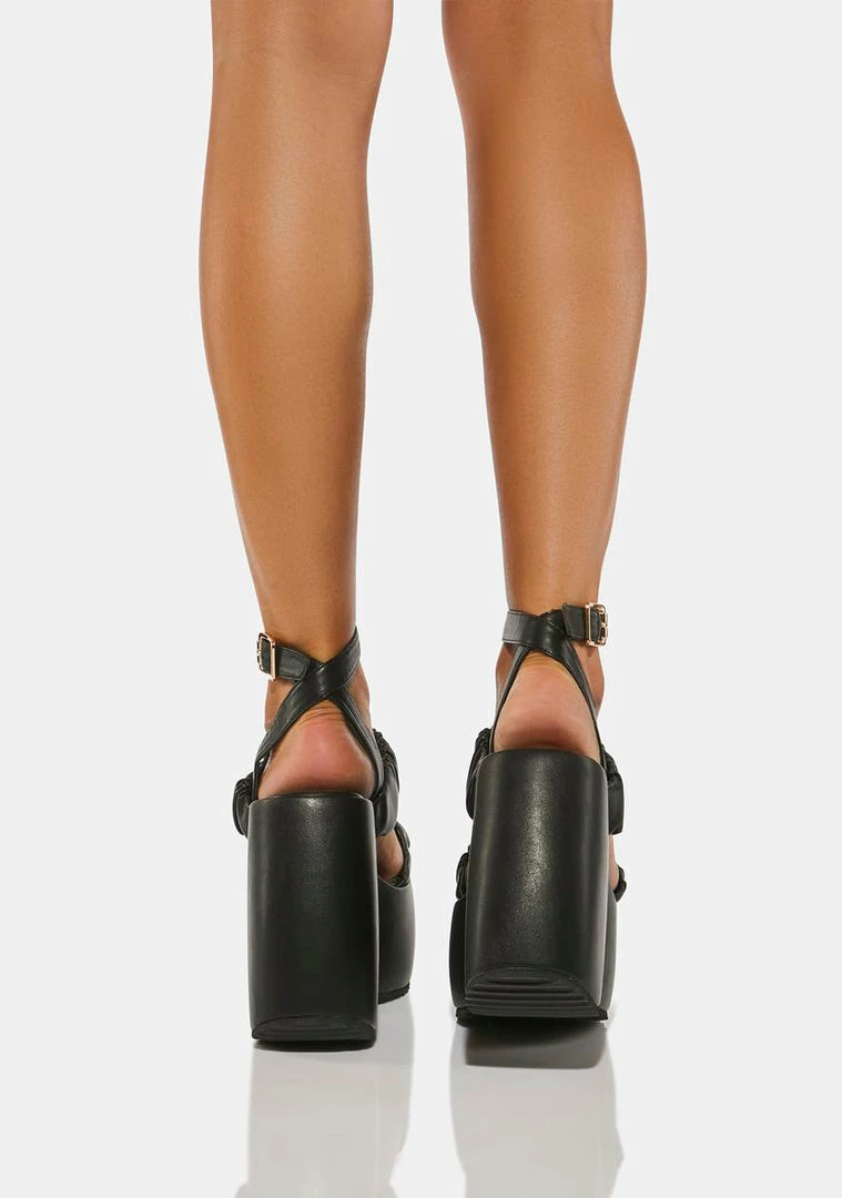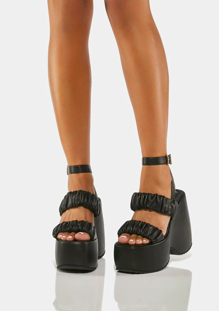 move those dancing feet! These sandals have a vegan leather construction, ruched upper straps, peep toes, adjustable buckle closures, and platform soles with block heels.