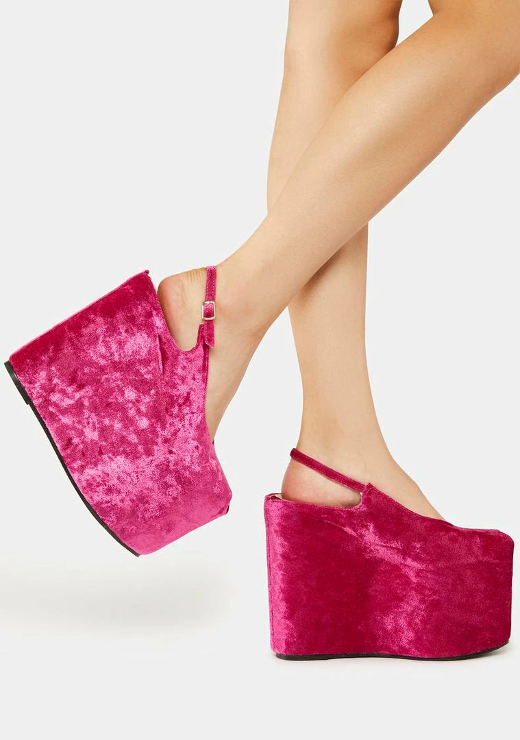 cuz they’re crushin’ on you. These platform wedges have a crushed velvet construction, peep toes, and adjustable buckled ankle straps.