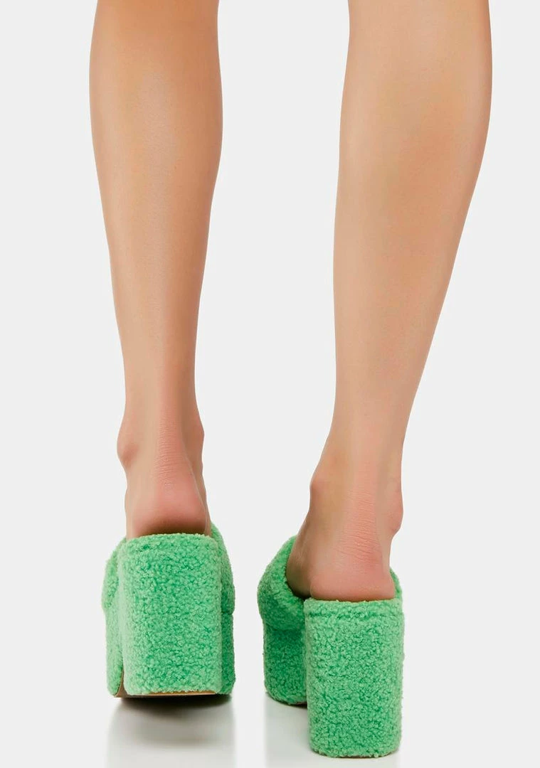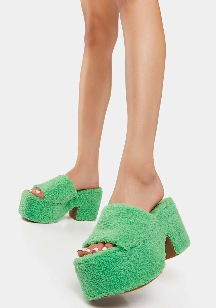 cuz it’s all about you. These platforms come in a faux fur construction, with a platform heel, and foot strap.