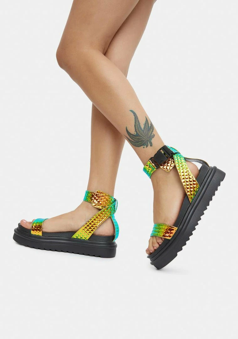 have an iridescent vegan leather upper, ankle buckle closures, and platform soles.
