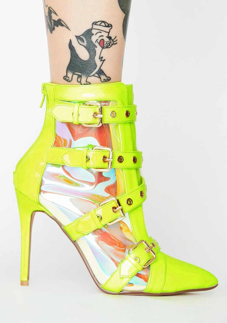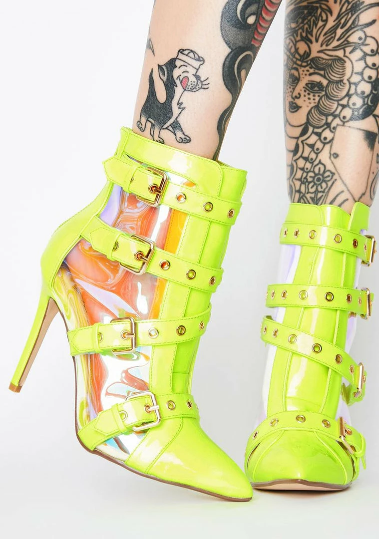 got ya glowinΓ’ΒΒ in the club, bb. Make some moves in these neon booties that have a patent vegan leather construction, four adjustable buckles along the uppers, and a clear iridescent vinyl detail.