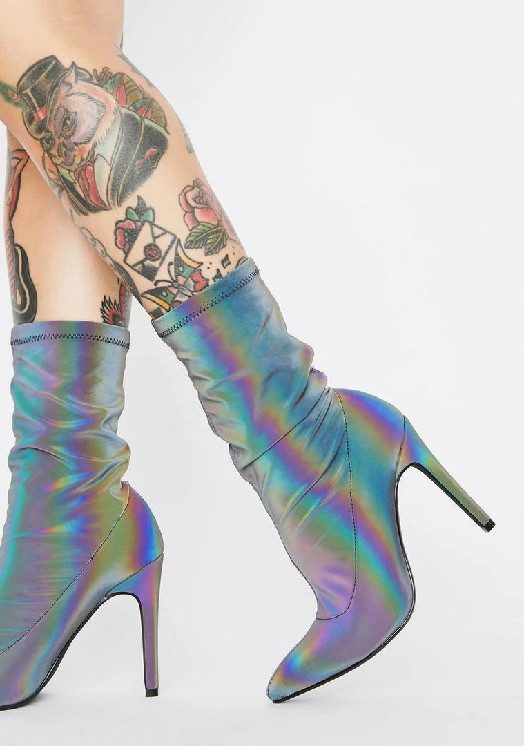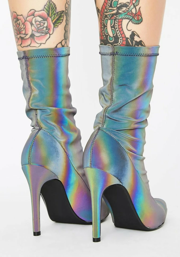 cuz youΓ’ΒΒre a natural born superstar! Glow up in these rainbow reflective booties that have pointed toes NΓ’ΒΒ sassy stiletto heels to outshine the basicz.