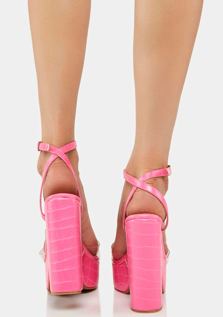 cuz you leave them wanting more! These heels have a vegan leather construction, a crocodile pattern, clear vinyl uppers, a square toe design, platform soles, block heels, and ankle buckle closures.