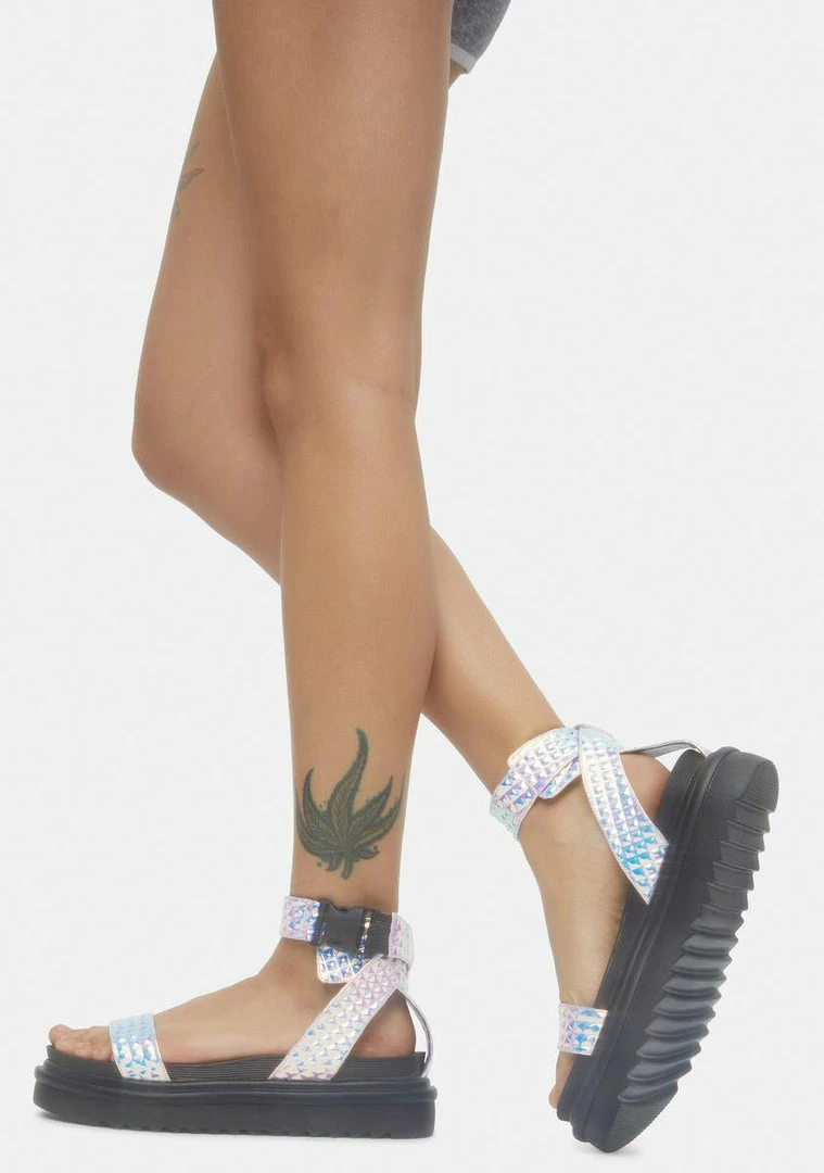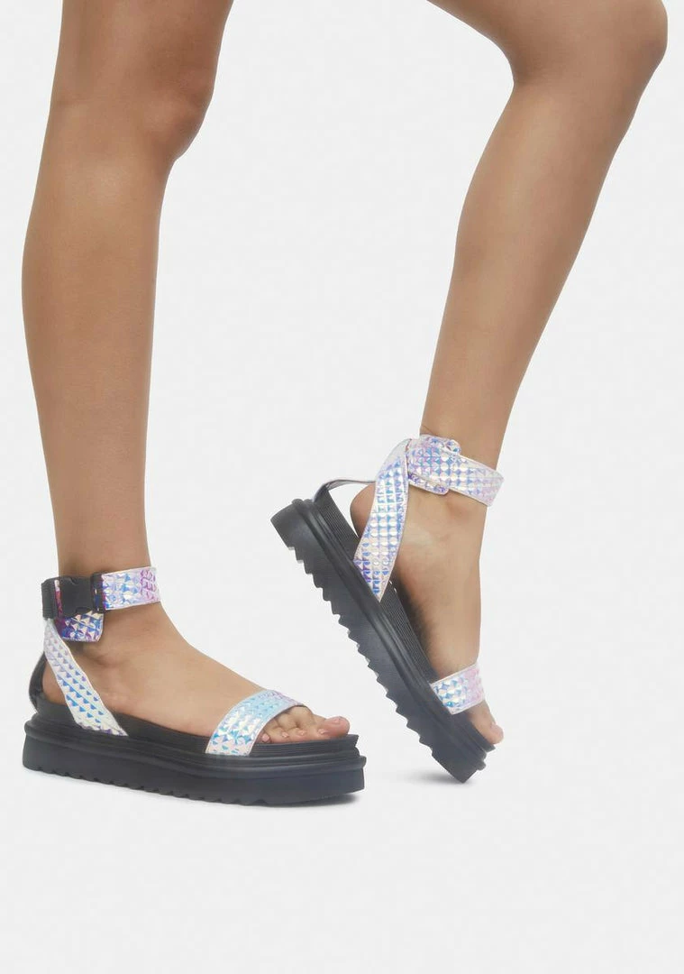 have an iridescent vegan leather upper, ankle buckle closures, and platform soles.