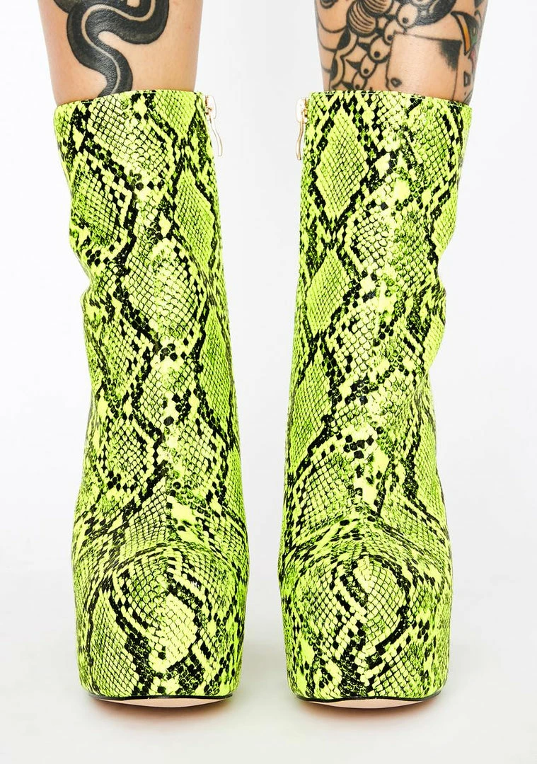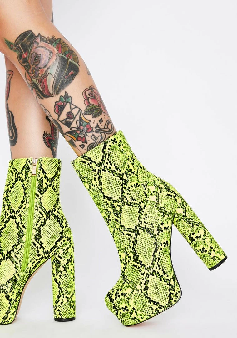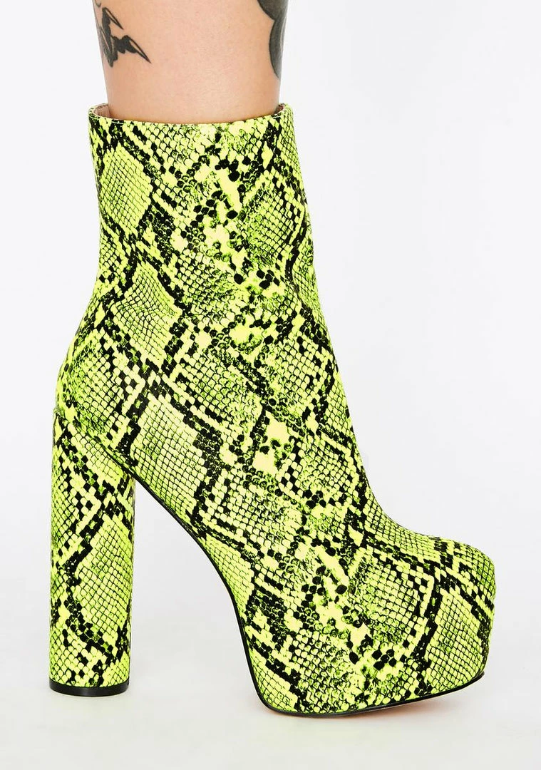 cuz youâre feelinâ hella sassy tonight! Strut ya stuff in these platform boots that have a neon snake print all ova, chunky rounded heels Nâ side zip closures.