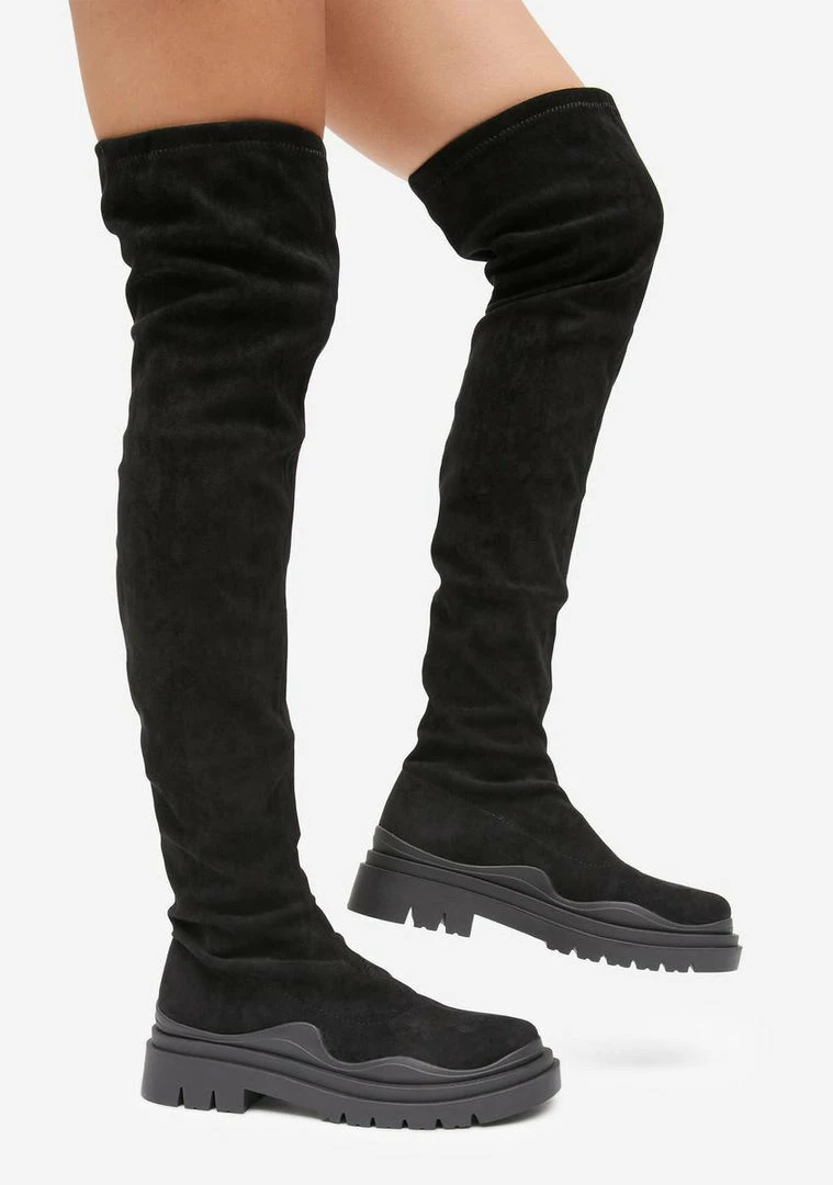 feature vegan suede uppers, a slip on style with a knee-high length, and platform soles with treaded bottoms.