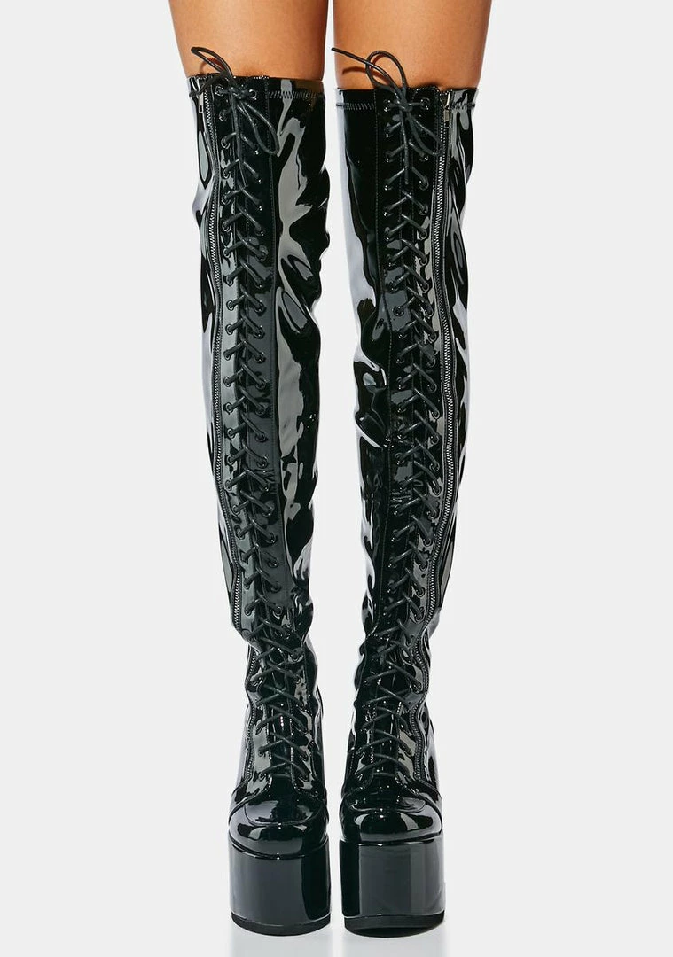 have a vegan vinyl leather construction, adjustable lace ups, and side zipper closures.
