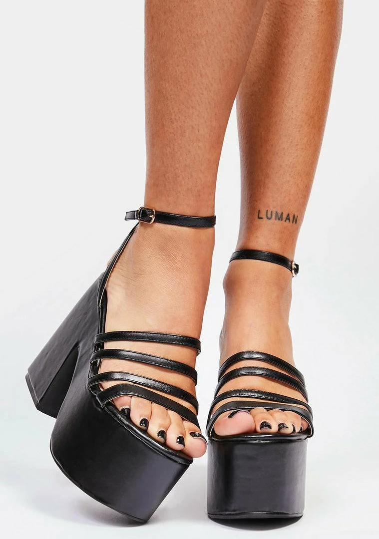 you’re stirring up trouble! These heels have a faux leather design, strappy uppers, wraparound buckle ankle closures, and tall platform soles with block heels.