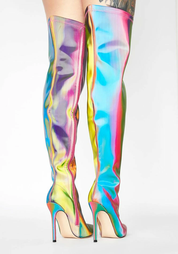 got you living your xxtra life, bb. Steal the spotlight in these thigh high boots that have a reflective, multi-colored construction, a pointed toe, a stiletto heel NΓ’ΒΒ side zip closures.