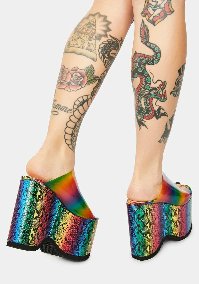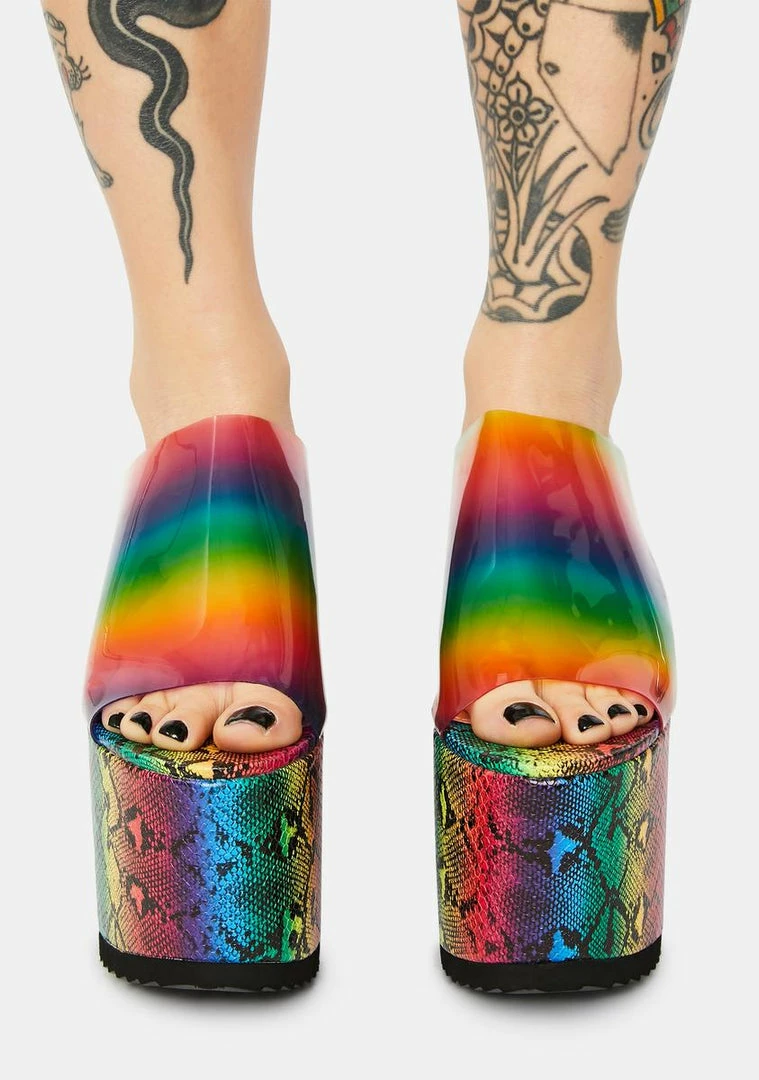 you know what’s what. These mega platform sandals have rainbow toe straps, ombre snakeskin soles, and treaded bottoms.