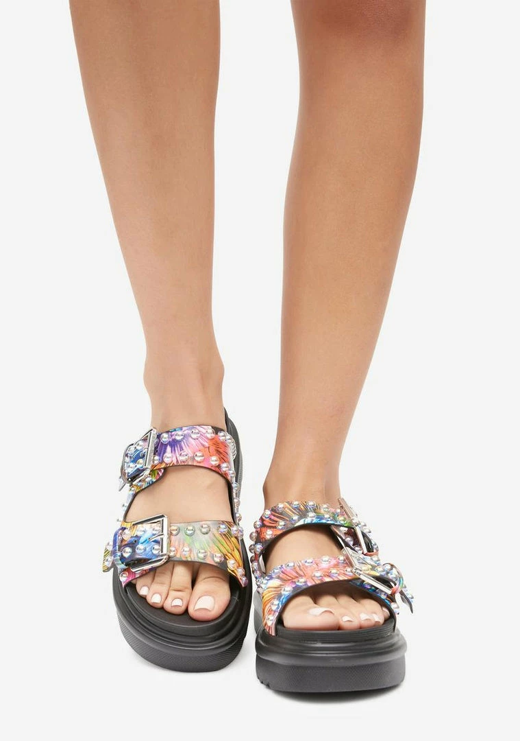 feature rainbow vegan leather uppers, iridescent pearl accents, adjustable buckle straps, and platform soles.