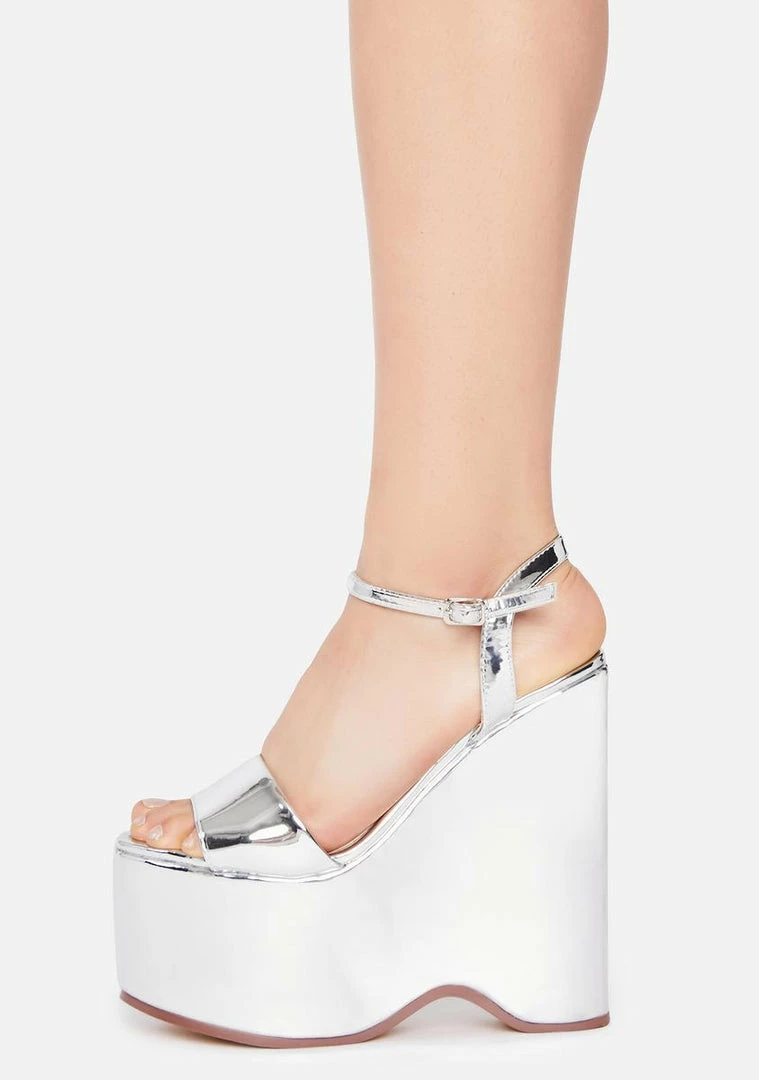 live it up in funky town. These shoes were made for a good time and have a reflective silver design all over, ankle strap closures, and thick wedge heels.