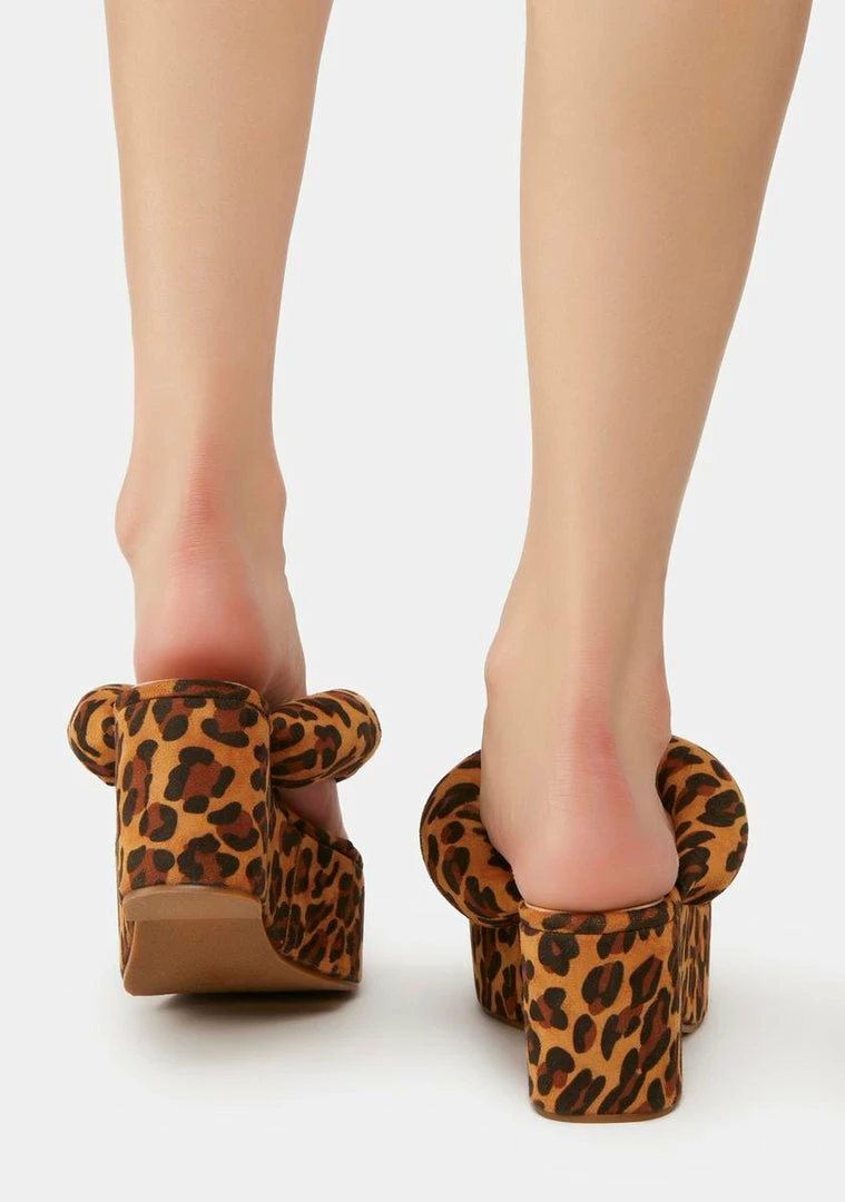 claim what’s yours. These sandals come with a heeled platform, in a vegan suede construction, with a thong strap, and a leopard print all over.