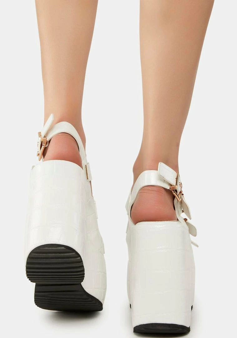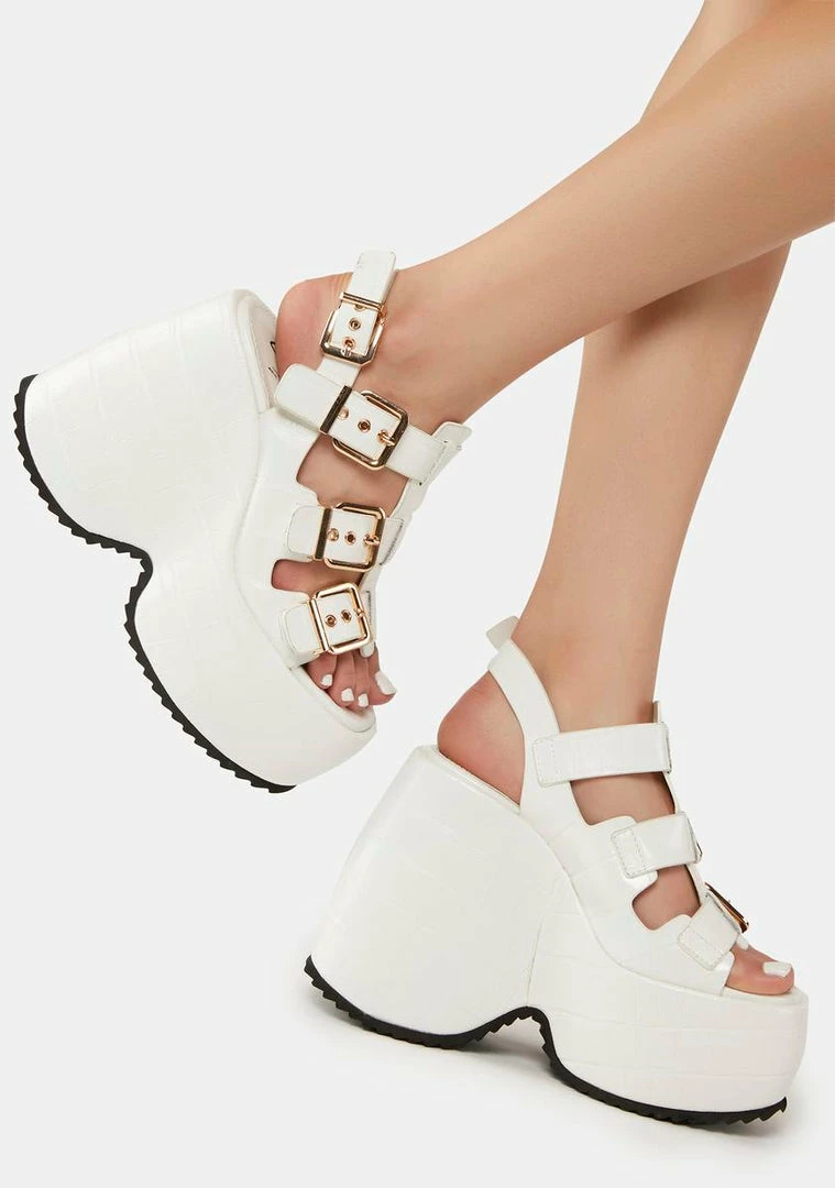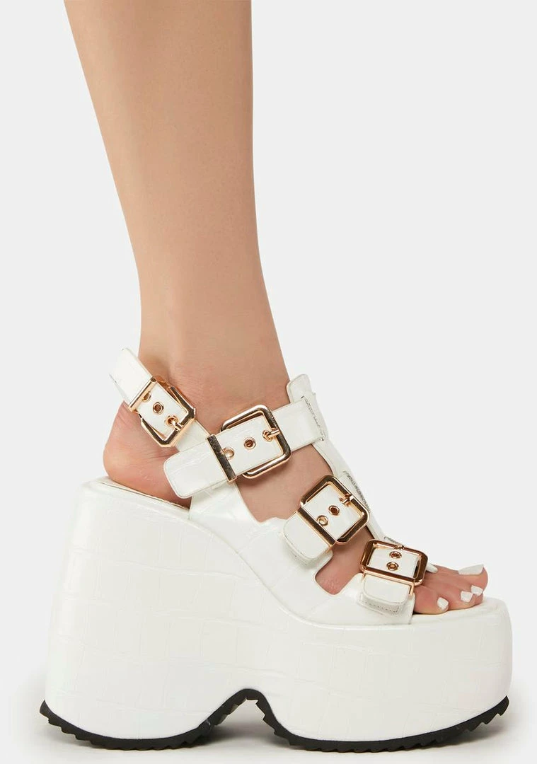 show them what they’re missing. These gladiator sandals have a vegan leather construction, faux croc texture, adjustable buckled straps, and tall platform wedges.