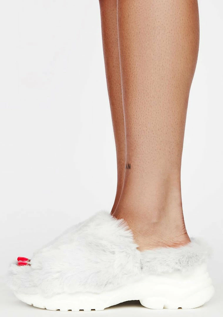 feature multi-colored faux fur uppers, peep toes, a slip on style, and chunky platform soles.