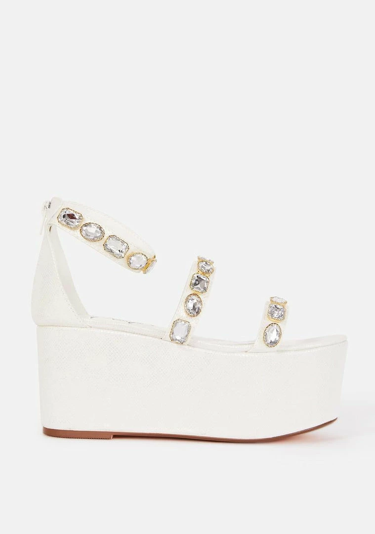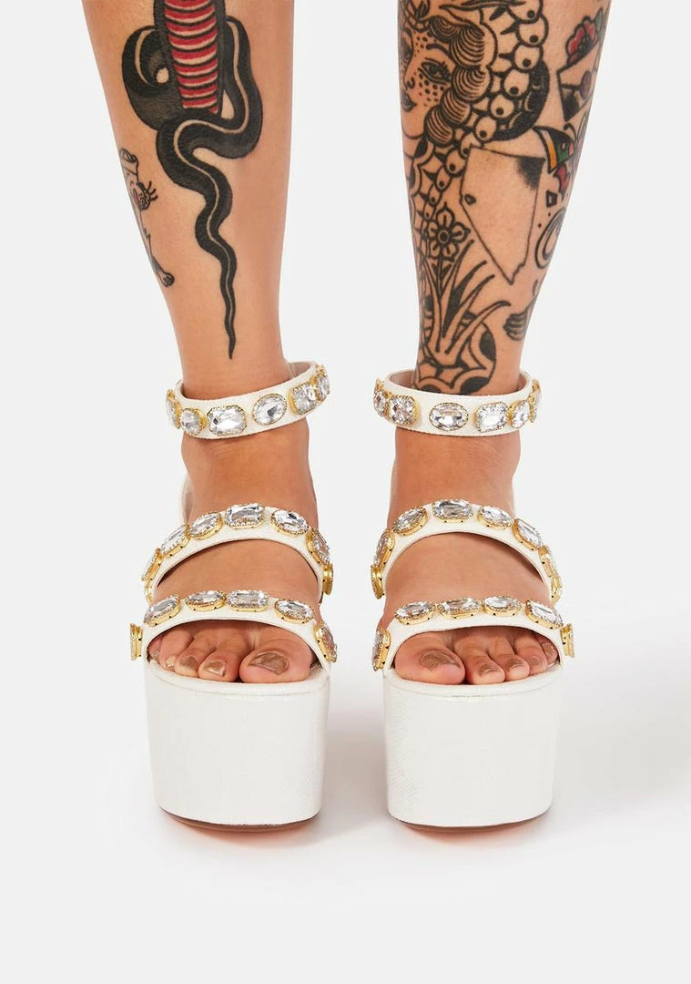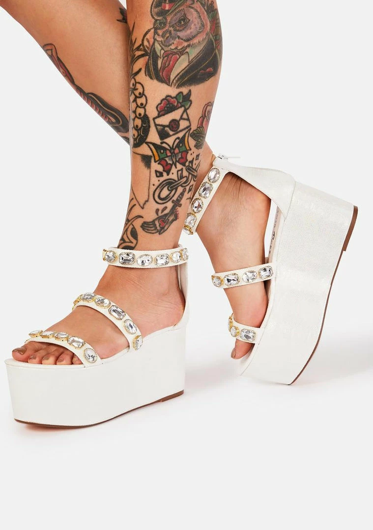 cuz diamonds are a girlΓ’ΒΒs best friend! These glitzy strappy sandals have chunky platform soles, rhinestone accents, and back zip closures.